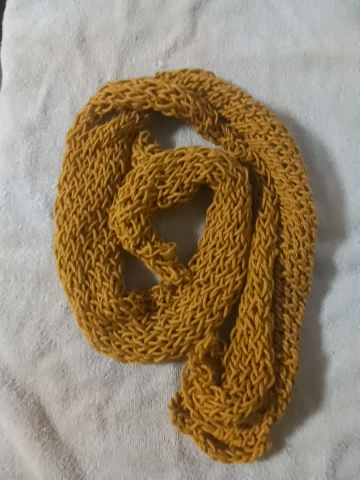 This is an adult hat I knitted on a loom. It is blue on the top and the bottom, and it is pink in the middle.